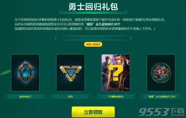 从好友召唤师获得邀请链接登录本页可以获得额外的“感恩”永久皮肤碎片10个